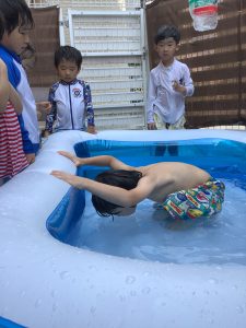 今回の水遊びではプールの枠に手を置いて顔をつける練習をしました✨