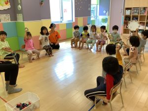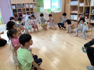 トライアングルやカスタネット、タンバリンを使いそれぞれ好きな楽器を手にリズム打ちをしました。
