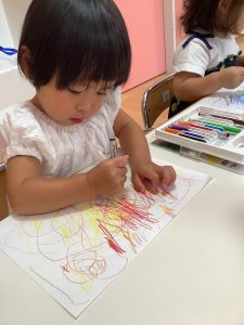 運動会の製作物を作ってます。お友だちにクーピーを渡しています