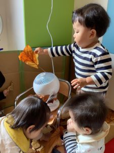サーキュレーターの風で葉っぱがヒラヒラ、ピューッと飛んでいく様子に大喜び✨