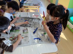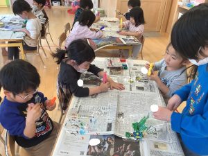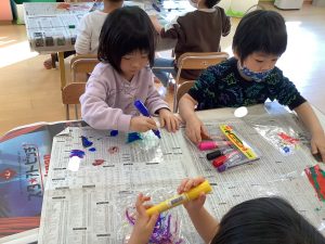 すいか組は凧揚げをするために凧を作りましたよ!保育士の話をしっかりと聞いた後は、一生懸命、凧にお絵かきをしました![]()