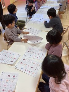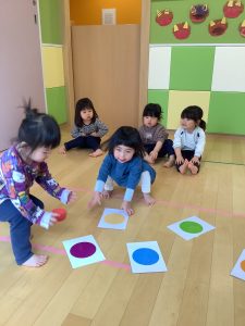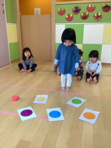 保育者の「which one is blue?」の質問に悩むことなくカードを取っていましたよ![]()
