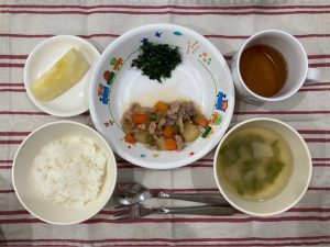 ごはん 味噌汁(かぶ・豆腐)肉じゃが ほうれん草のお浸し りんご
