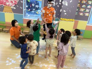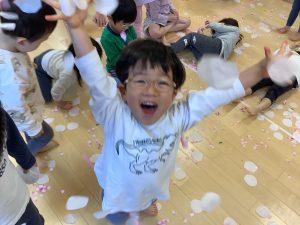という事で、リトミックをしたり桜の季節なので、造花の桜の花びらを使ってフラワーシャワーをしたりしました![]()