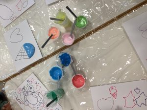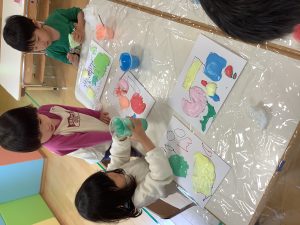 画用紙に絵を描き、その上に作ったカラーホイップを乗せました