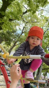 りんご組のお友だちは先生に手伝ってもらいながら幼児向けの遊具にも挑戦!