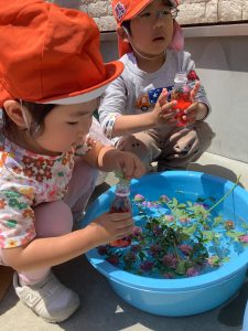 好きな花を見つけて、予め作っておいた色水の中に花を浮かべました💐
