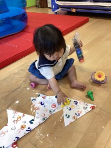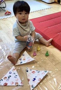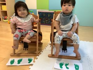 少し前までは苦手だった絵の具を使った足型とりですが、少しずつ慣れてきたようで、可愛らしい足型を取ることが出来ました!