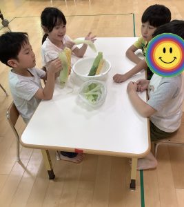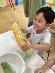 食育の一環でとうもろこしの皮むきをしました