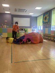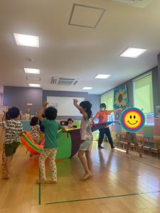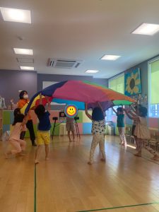 パラバルーンでは子どもたちが声を掛け合いながら上下左右に動かします!
