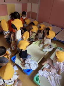 午睡時間の中での避難訓練だったこともあり、涙が出る子どもも…