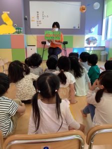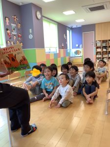今日も元気いっぱいの伊丹園の子どもたち。幼児クラスの読み聞かせの様子です。