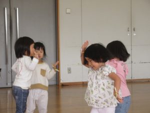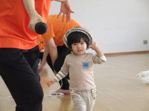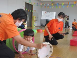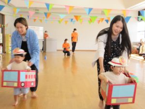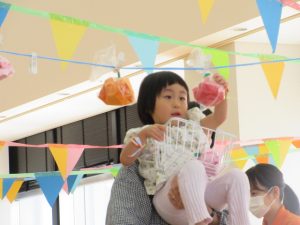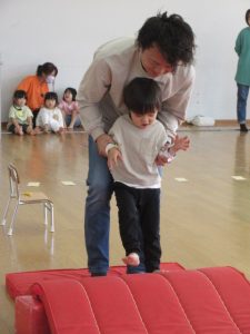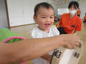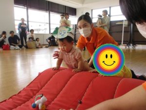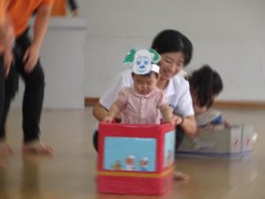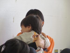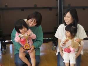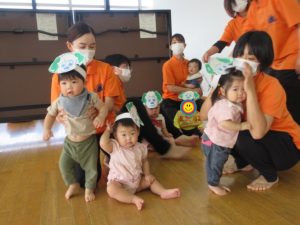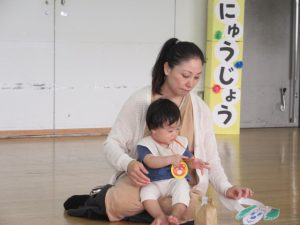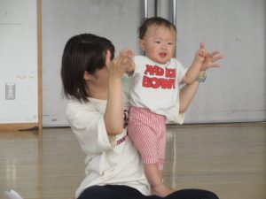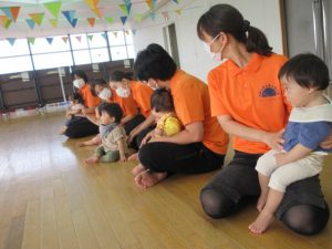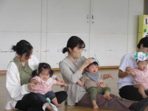 最後はお母さんのお膝の上で体操をしました。みんな大好き「ピカピカブー」です!