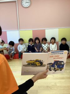 子どもたちが大好きなはたらくくるま。郵便車、キャリアカー、ブルドーザーなどが出てき、子どもたちもととても集中してみています。