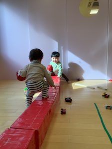 コーナー遊びだったので普段座っている椅子を仕切りとして使っていると、子ども達は座ったり一本橋として渡ったりとさまざまな遊び方をしていましたよ![]()