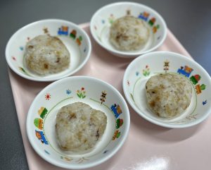 おやつのおにぎりは、手づかみ食べをするお友達も自分で食べることができるおやつです。自分で食べられることがとても嬉しそうでした☺
