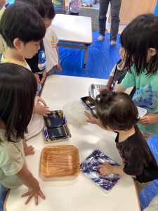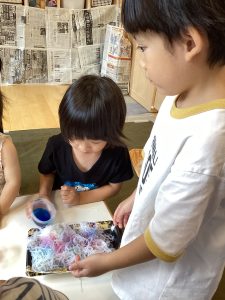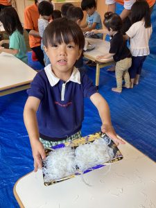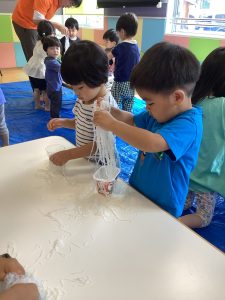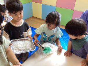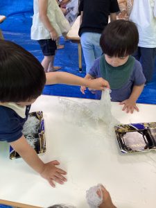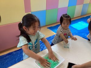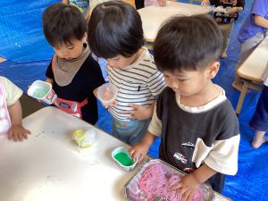 その後はみんなで感触遊びスタート👀🫧今回の感触遊びは春雨を使っています!中には感触が苦手で触れていない子どももいましたが、ほとんどの子どもたちが楽しんでくれましたよ