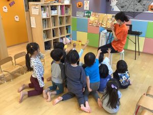 見つけた子から、手をあげて、当てられた子が前に出てみんなに「ここだよ!」と教えていますよ。