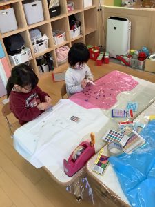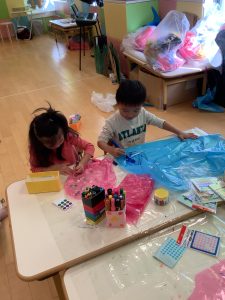 まずはすいか組さんです。なにやら相談しながら製作をしています。何を作っているのかは当日のお楽しみです![]()