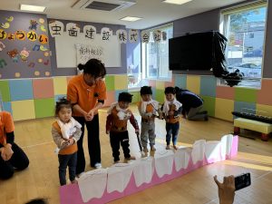 中には、いつもと違う雰囲気の中での発表だったので「恥ずかしい…」という子どももいましたが、保育士と一緒にステージに立つことが出来ました!