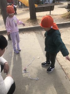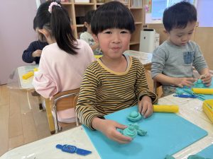 近くで見ていたりんご組のお友だちも興味津々で作ったものを見ていましたよ🍎👀