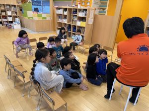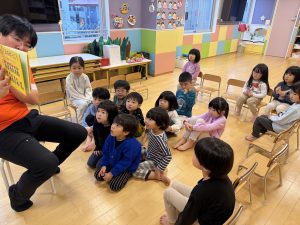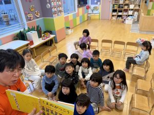 こぐまの兄弟が学校に行って授業を受け、家に帰って寝るまでの1日を描いたもので、くまたちの行動に子どもたちは楽しんでいましたよ。✨