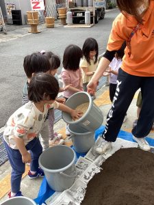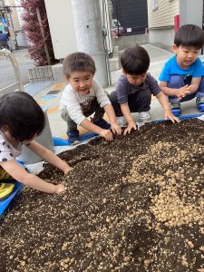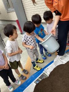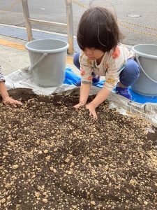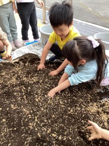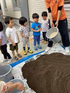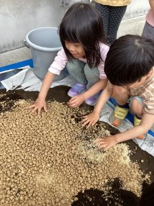 今回のブログは幼児クラスの子どもたちがお米を作るために使用する3種類の土を混ぜる様子をお届けします![]()