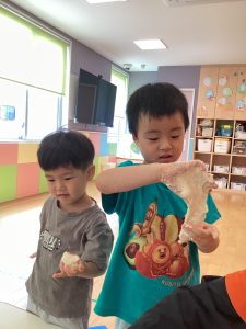 今回のブログは、水遊びと小麦粉粘土を楽しんでいる様子をお届けします💌