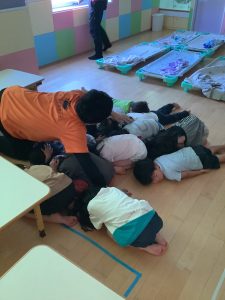 そのため、子どもたちは眠たい中での避難訓練となりましたが、保育者の地震を知らせる声にすぐに反応し、保育者の元へ集まり頭を隠して待機することが出来ました!