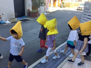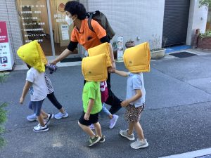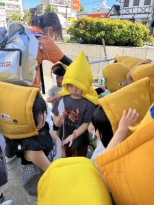 そして少し暑い中ではありましたが、日陰を作りながら第一避難場所である伊丹小学校まで行ってきました。この間も子どもたちは話したり走ったりすることなく移動がスムーズに出来ましたよ。