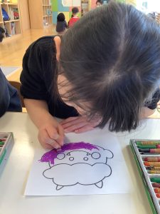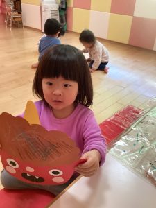 髪の毛をクレヨンでカキカキしたり!とても可愛らしい鬼が完成したよ!!
