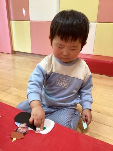 まずは恵方巻き作りから!好きな色のシールをペタペタ🩵指先が器用になってきてシール貼りもとても上手になりました
