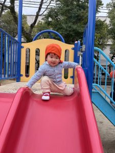 公園に着いたら早速滑り台!2人揃ってハイチーズ📸✌️お友だちと一緒のタイミングで滑るのも楽しいよね!