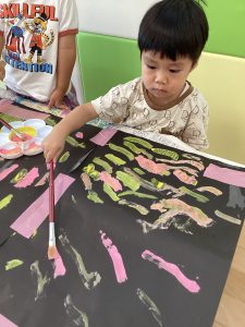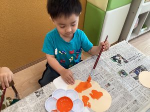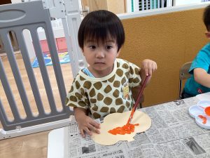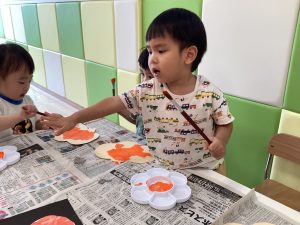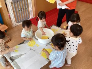 お月見に向けて黄色い絵の具で大胆にペタペタしてくれました!