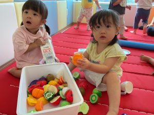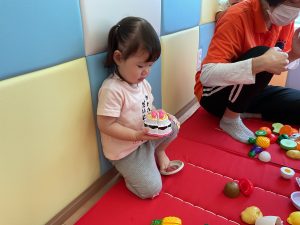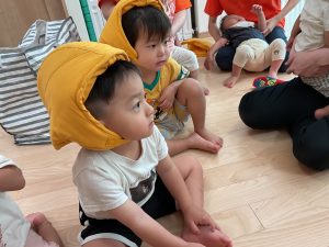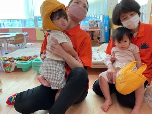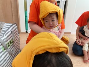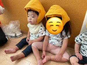 頭巾をかぶり、保育者のお話を聞いてくれました。