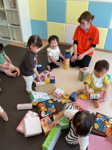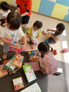 いちご組さんは、廃材で作った積み木で遊びました