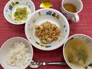サンライズキッズ保育園 ◎給食の様子 今日の給食は、厚揚げのそぼろ煮です。パサつきやすいひき肉も、片...