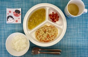 今日の給食は、人気メニューのカレーライスです♪ 保育室にも食欲をそそるカレーの良い匂いが広がるので「お腹空いたね」「早く食べた~い!」と給食の時間を楽しみにしている様子でした。
