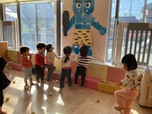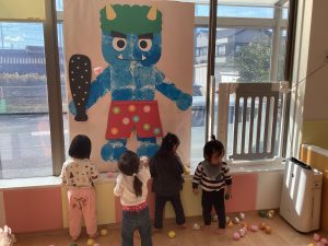 豆に見立てたボールを「えい!」っと鬼に投げみんなでやっつけました