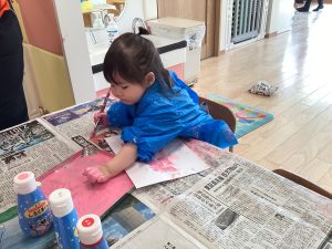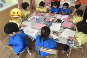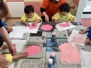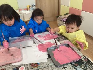 ピンクの絵の具を使ってフィンガーペインティングをしました![]()