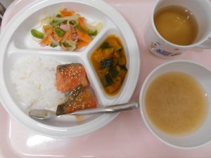 ・ごはん、みそ汁、鮭の香りみそ焼き、野菜炒め、カボチャの甘辛煮