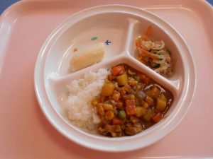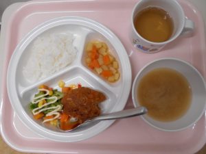 ・ごはん、カレーシチュー、切り干し大根のサラダ、バナナ