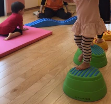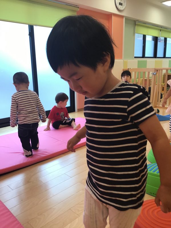 マットやバランスストーンを使って遊ぶ障害物レース風の遊びです![]()