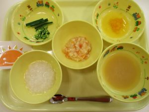 粥 味噌汁 そぼろ煮 スティックきゅうり みかん缶