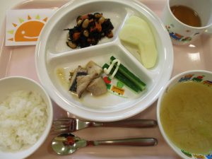 ご飯 味噌汁 さばの味噌煮 ひじきの炒り煮 スティックきゅうり