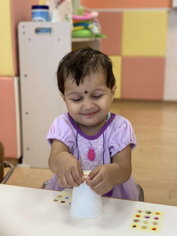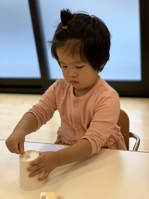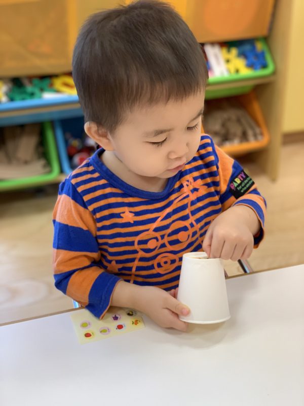 シール貼り一つでも、1人ひとりの個性が出るもので、まっすぐに貼る子、らせん状に並べて貼る子、無造作にたくさん貼る子、一定の間隔で貼る子など様々でした![]()