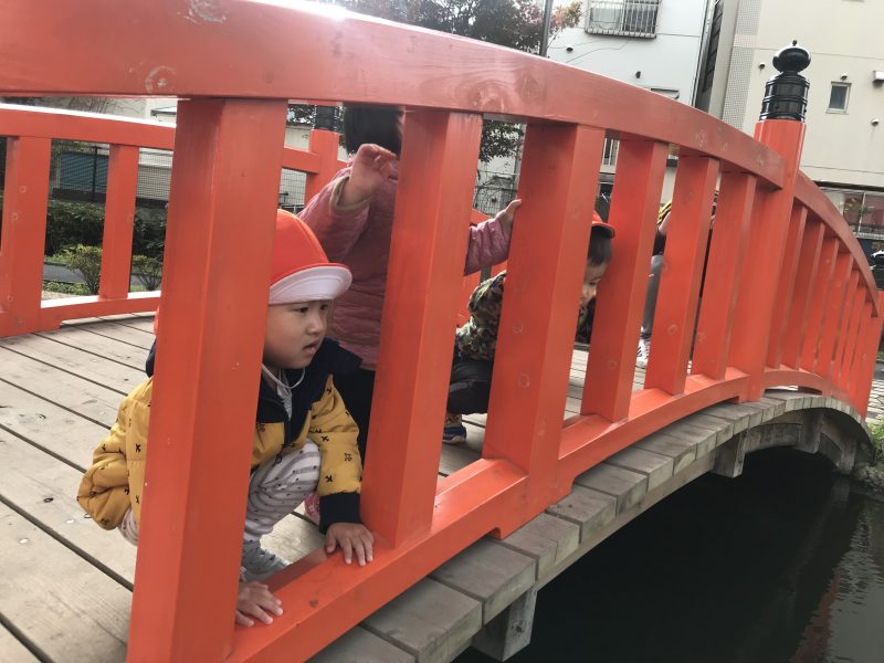 亭園につくと、普段行く公園にはない池があったり、橋がかかっているので子ども達も嬉しそうにしてくれていました![]()