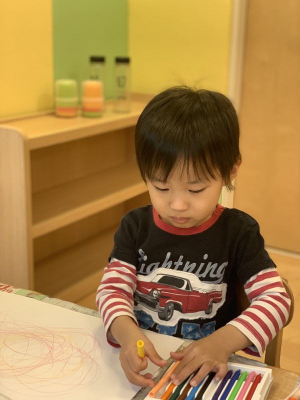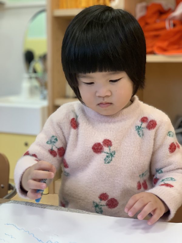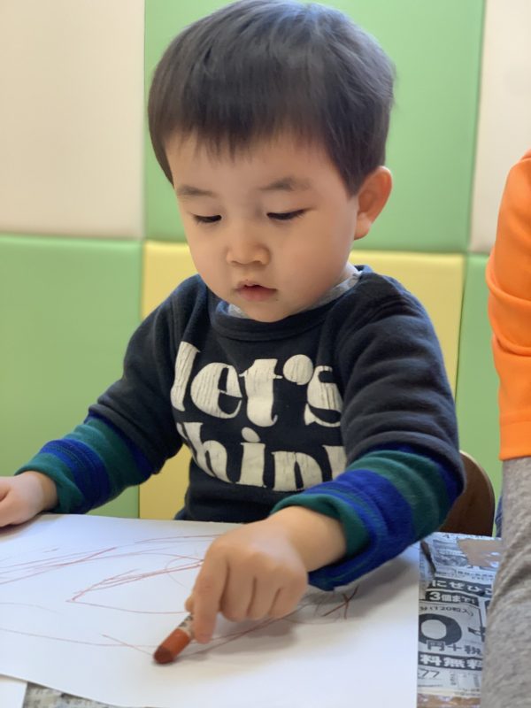 丸を書いたり、点々をかいたりはもちろんですが保育士に聞きながらお友達同士で顔をかきあったりして楽しくお絵かきをしてくれていました![]()