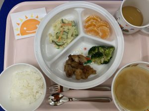 軟飯 味噌汁 チキンソテー ゆで野菜 おかか和え みかん