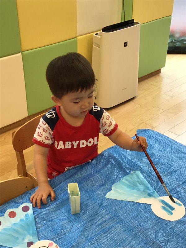 まだ絵の具になれていないお子さんもいるので保育士たちと一緒に楽しんでみました![]()